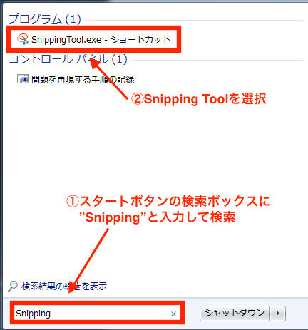 まず、スタートボタンの検索ボックスに”Snipping”と入力して、Snipping Toolを検索します。検索して出てきた“SippingTool.exe – ショートカット”をクリックして、Snipping Toolを開きます。