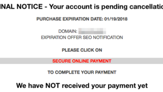 アフィリエイト独自ドメインの架空請求メールにご注意 「FINAL NOTICE – Your account is pending cancellation」 先日、取得している独自ドメインに対して請求メールが来ました。 全て英文で記載されており、もっともらしいことが書かれていますが、架空請求ですのでご注意ください。 2018.01.14アフィリエイト