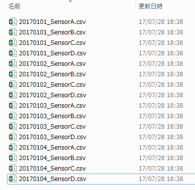 例えば、日付とデータ種類を元に命名されたファイル名のセンサログデータがフォルダに大量にあるとします。